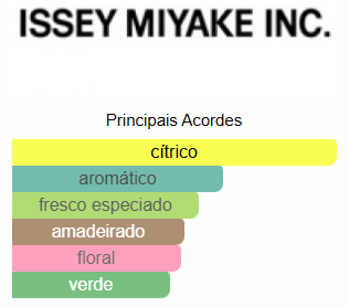 L'Eau d'Issey Pour Homme de Issey Miyake é um perfume Aquático Amadeirado Masculino. As notas de topo são: Yuzu, Limão, Bergamota, Lúcia-lima, Mandarina, Cipreste, Calone, Coentro, Estragão e Sálvia. As notas de coração são: Lótus azul, Noz-moscada, Lírio-do-Vale, Gerânio Bourbon, Açafrão, Canela do Ceilão e Resedá. As notas de fundo são: Vetiver do Tahiti, Almíscar, Cedro, Sândalo, Âmbar e Tabaco.
